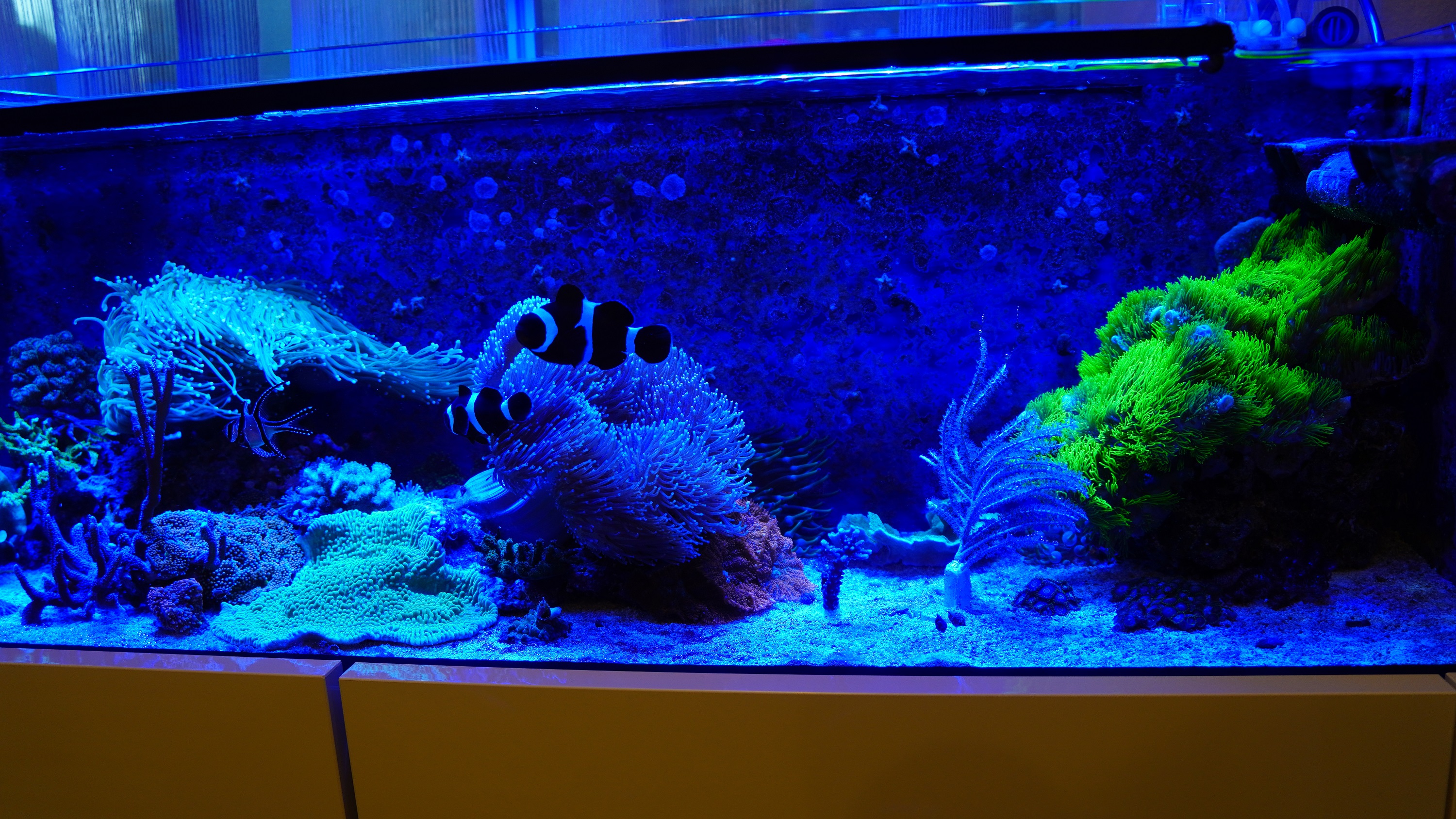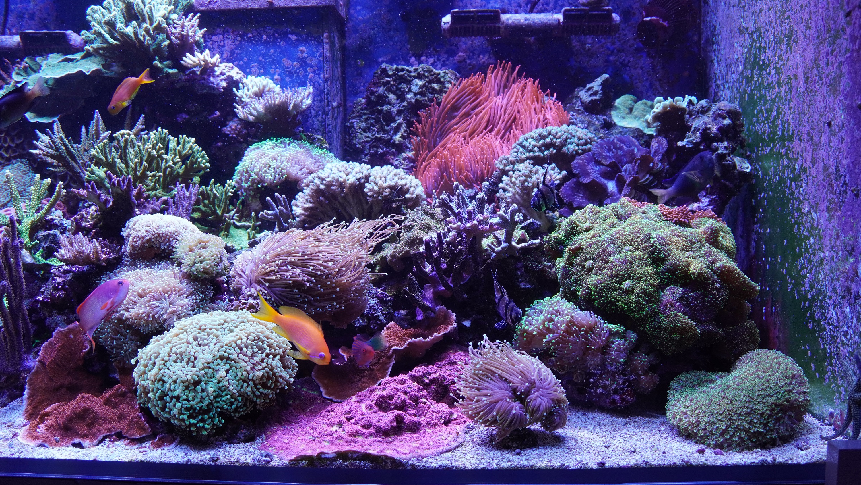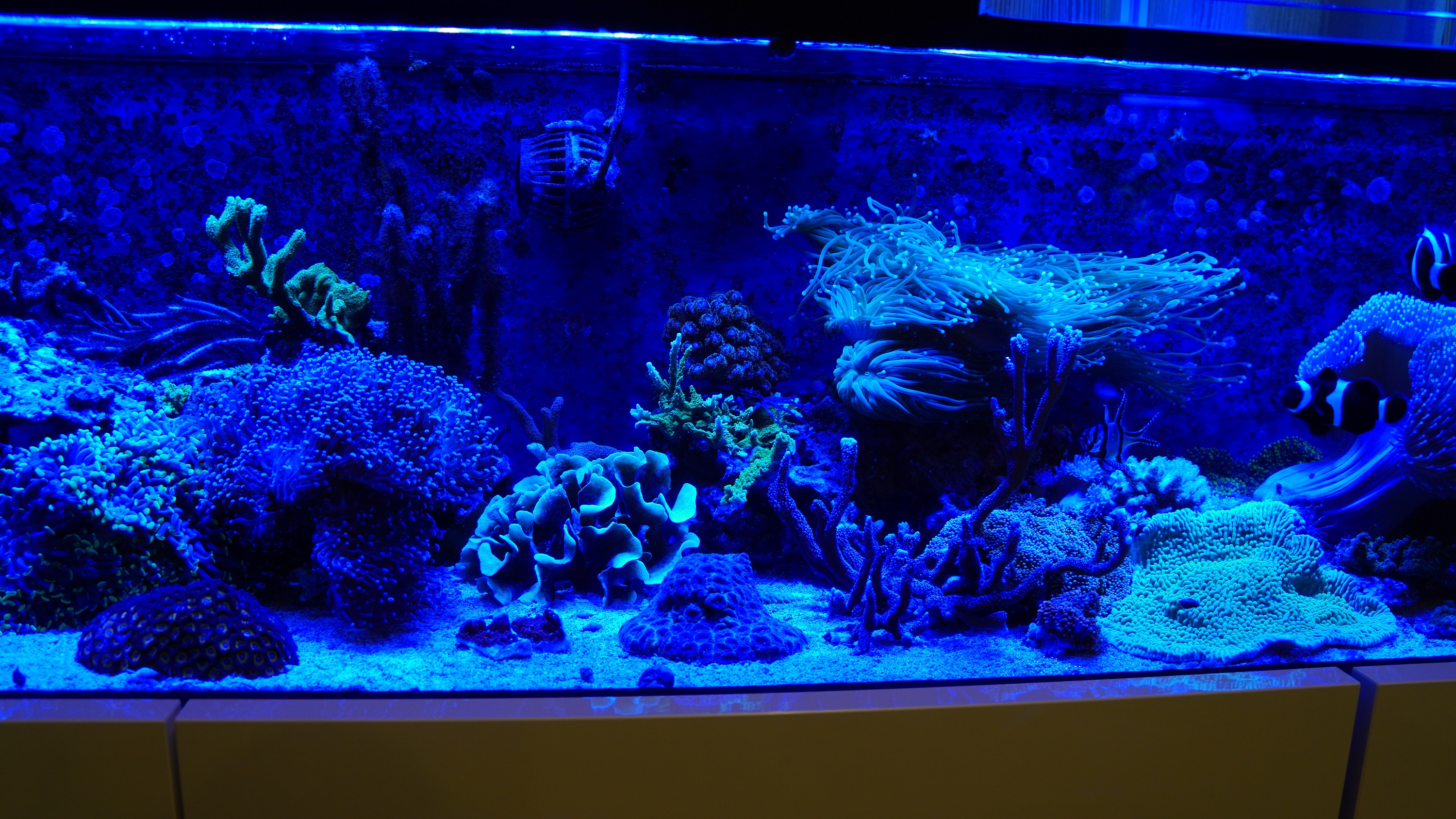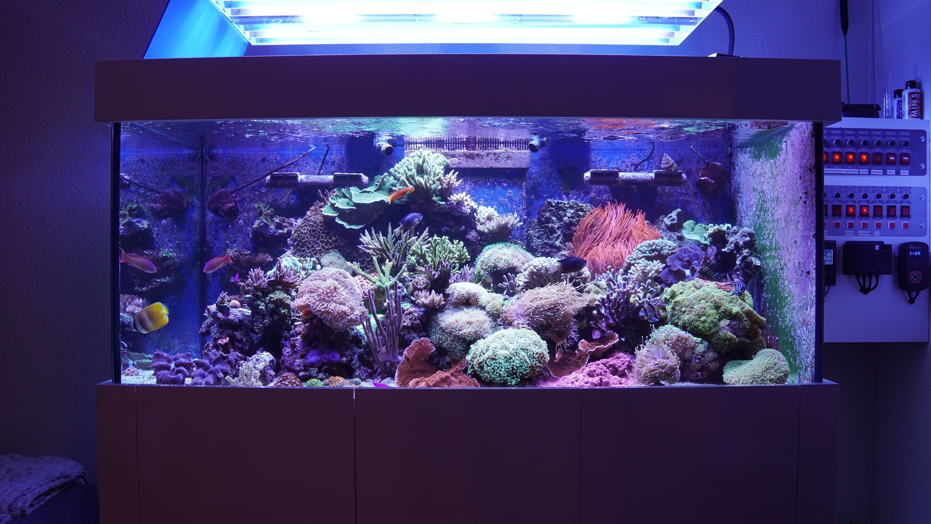 wie gestern angekündigt stelle ich euch mal kurz meine beiden Becken vor. Das grössere Becken mit fast 600 L steht im Wohnzimmer und das kleinere Becken mit ca. 140L steht im Esszimmer. Bei beiden Becken handelt es sich um ein Riff-Mischbecken.