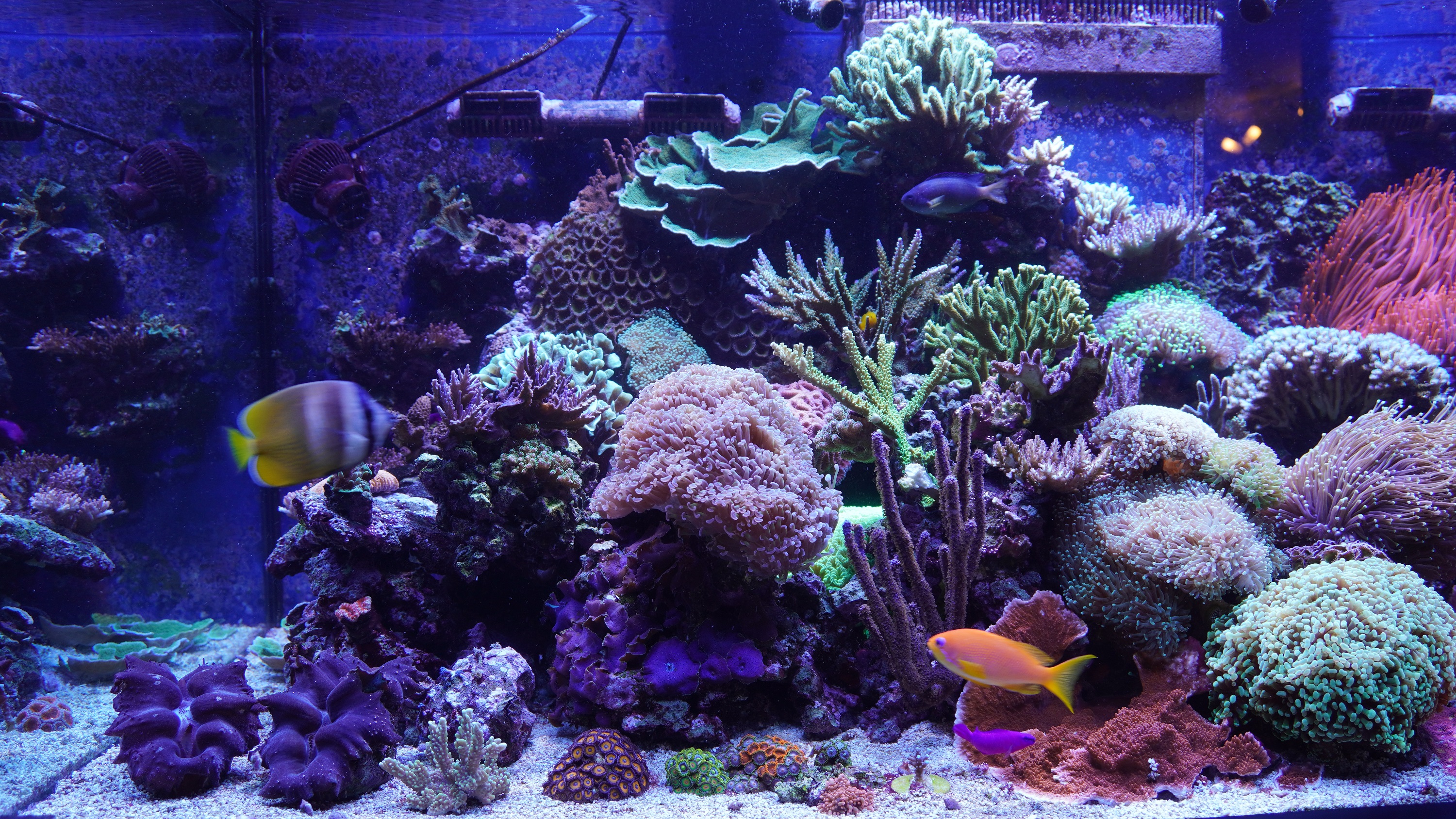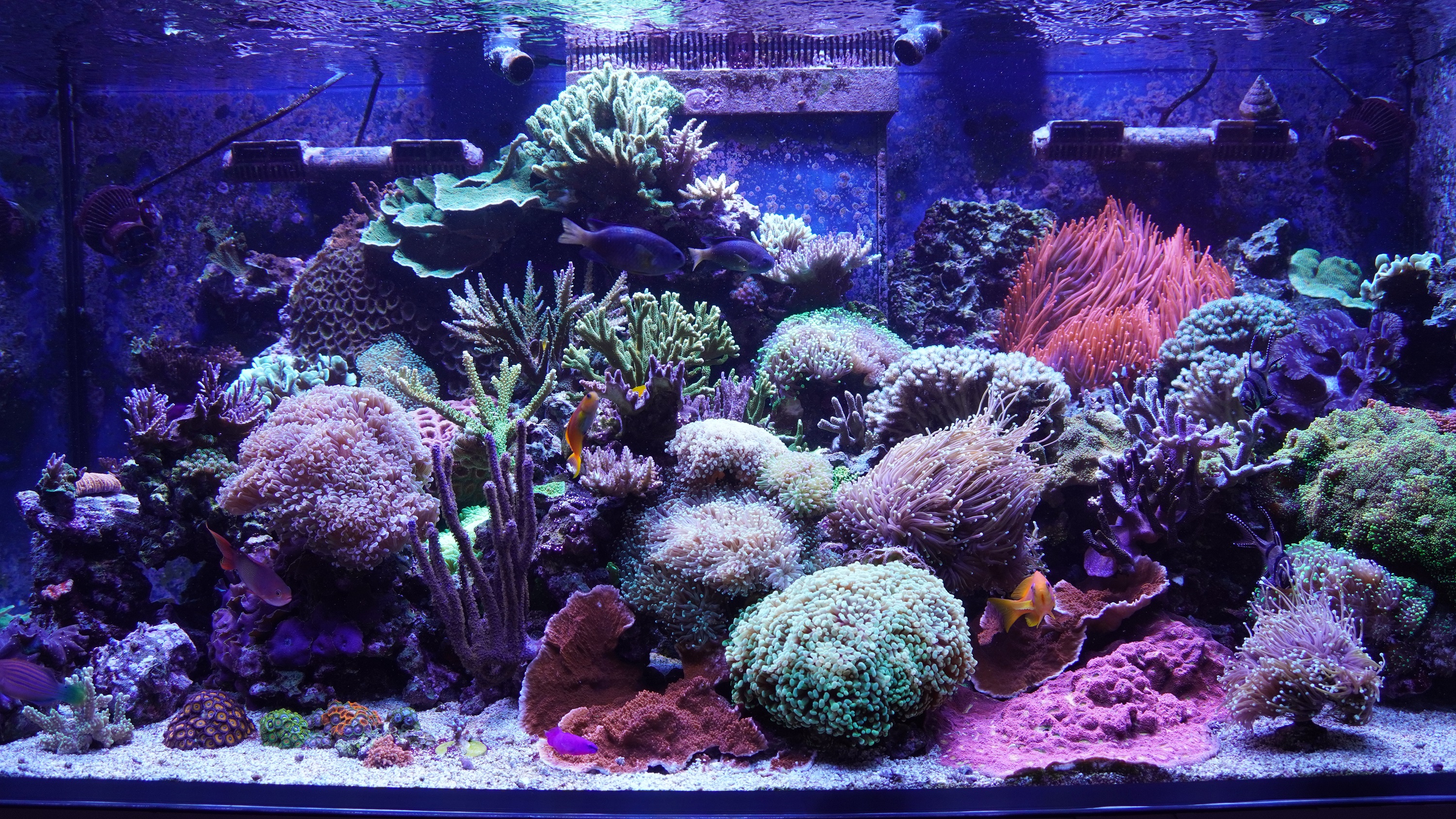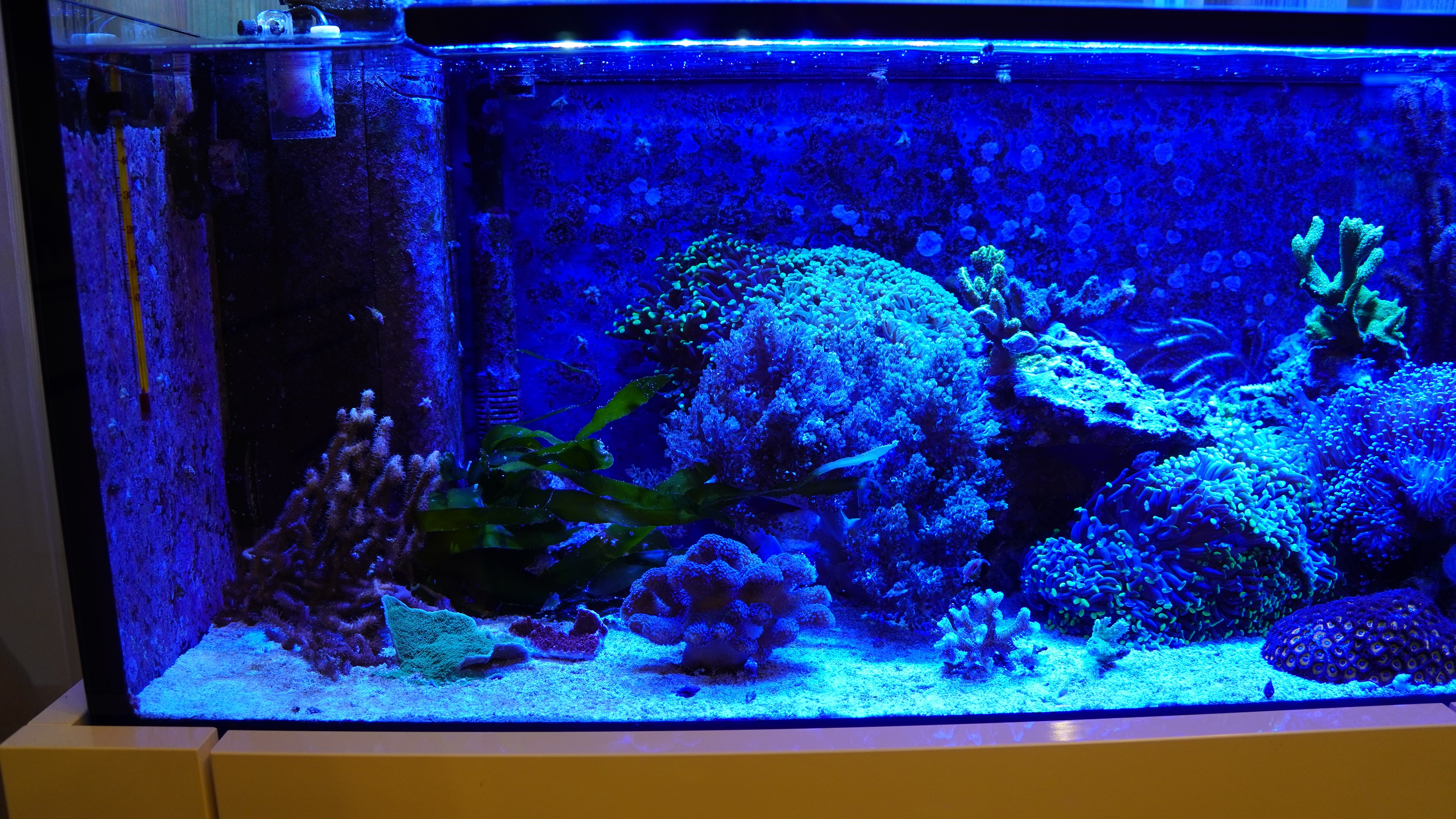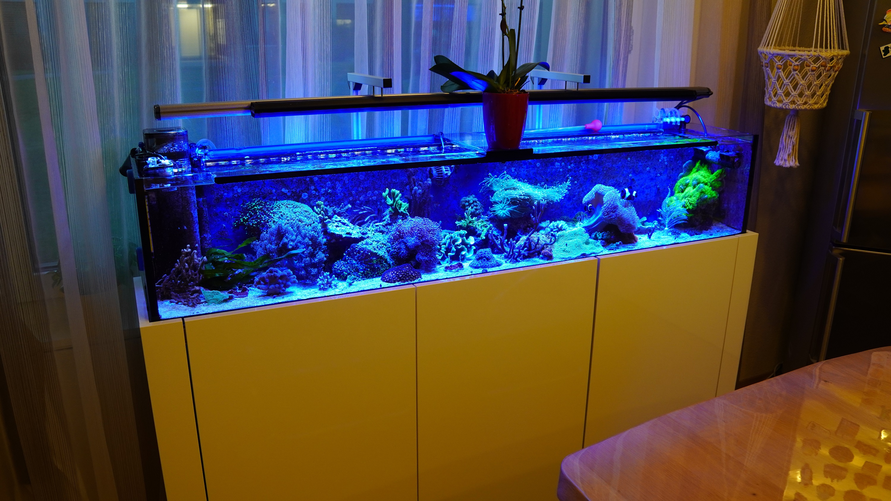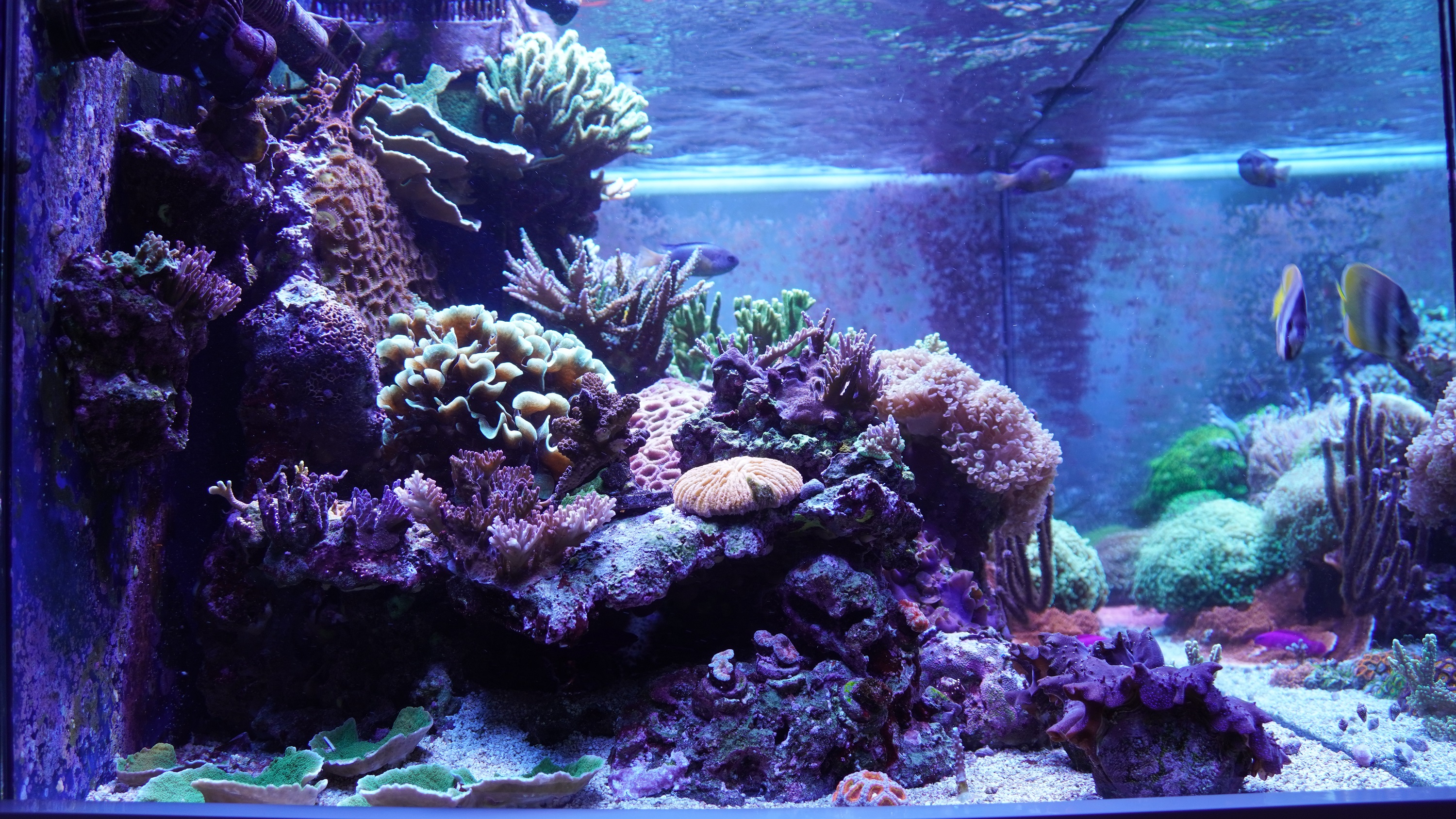 wie gestern angekündigt stelle ich euch mal kurz meine beiden Becken vor. Das grössere Becken mit fast 600 L steht im Wohnzimmer und das kleinere Becken mit ca. 140L steht im Esszimmer. Bei beiden Becken handelt es sich um ein Riff-Mischbecken.