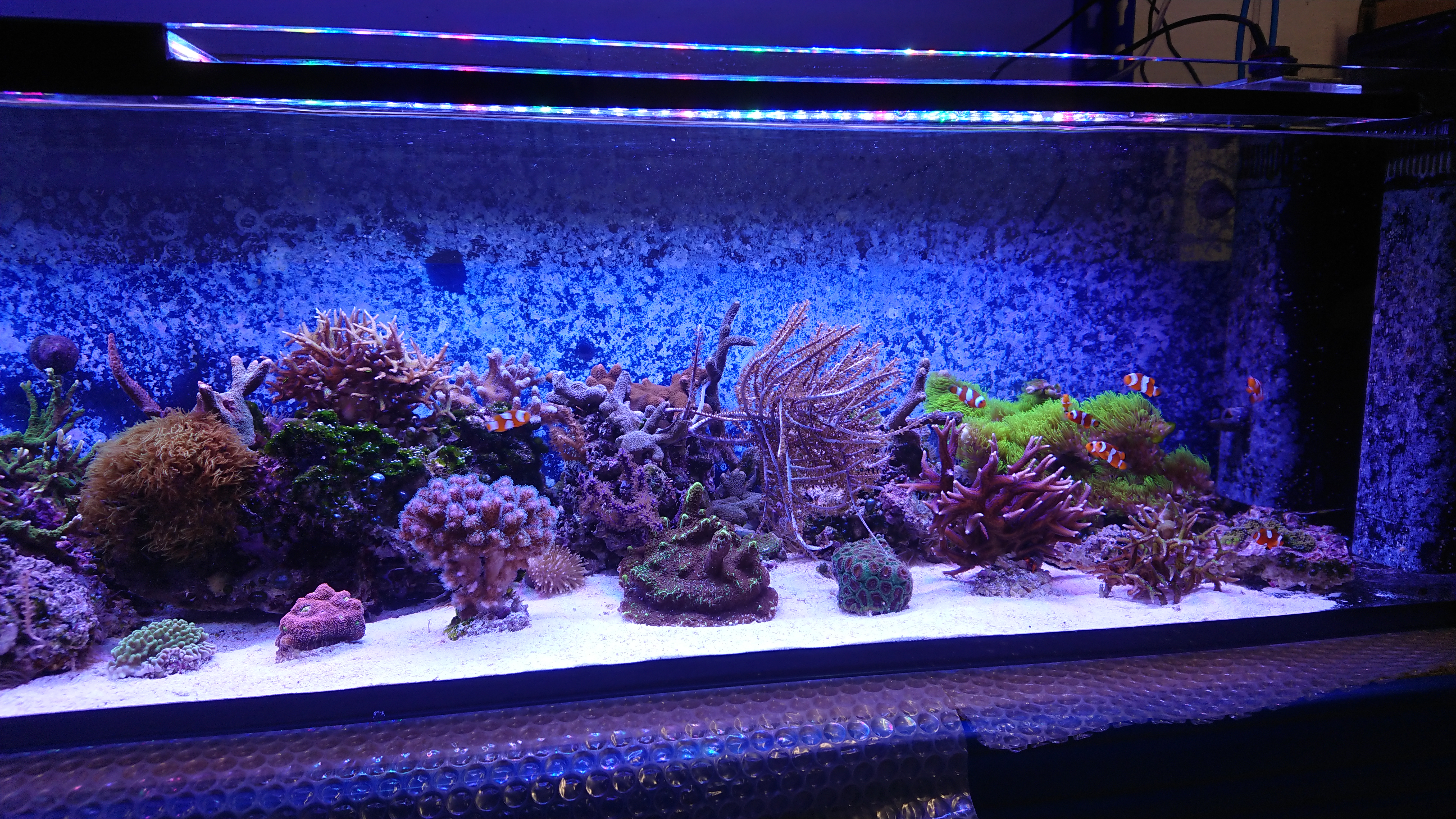 Das Esszimmerbecken hab ich irgendwie nur so halbherzig aufgebaut, ursprünglich sollte das Becken für meine Nachzuchten an Ocellaris und Kaudernis sein, aber da ich seit ein paar Jahren nicht mehr züchte, ist das Becken nur eine Art Backup Lösung oder Reserve. Hier werde ich mal ein bisschen mehr und besser gestallten.