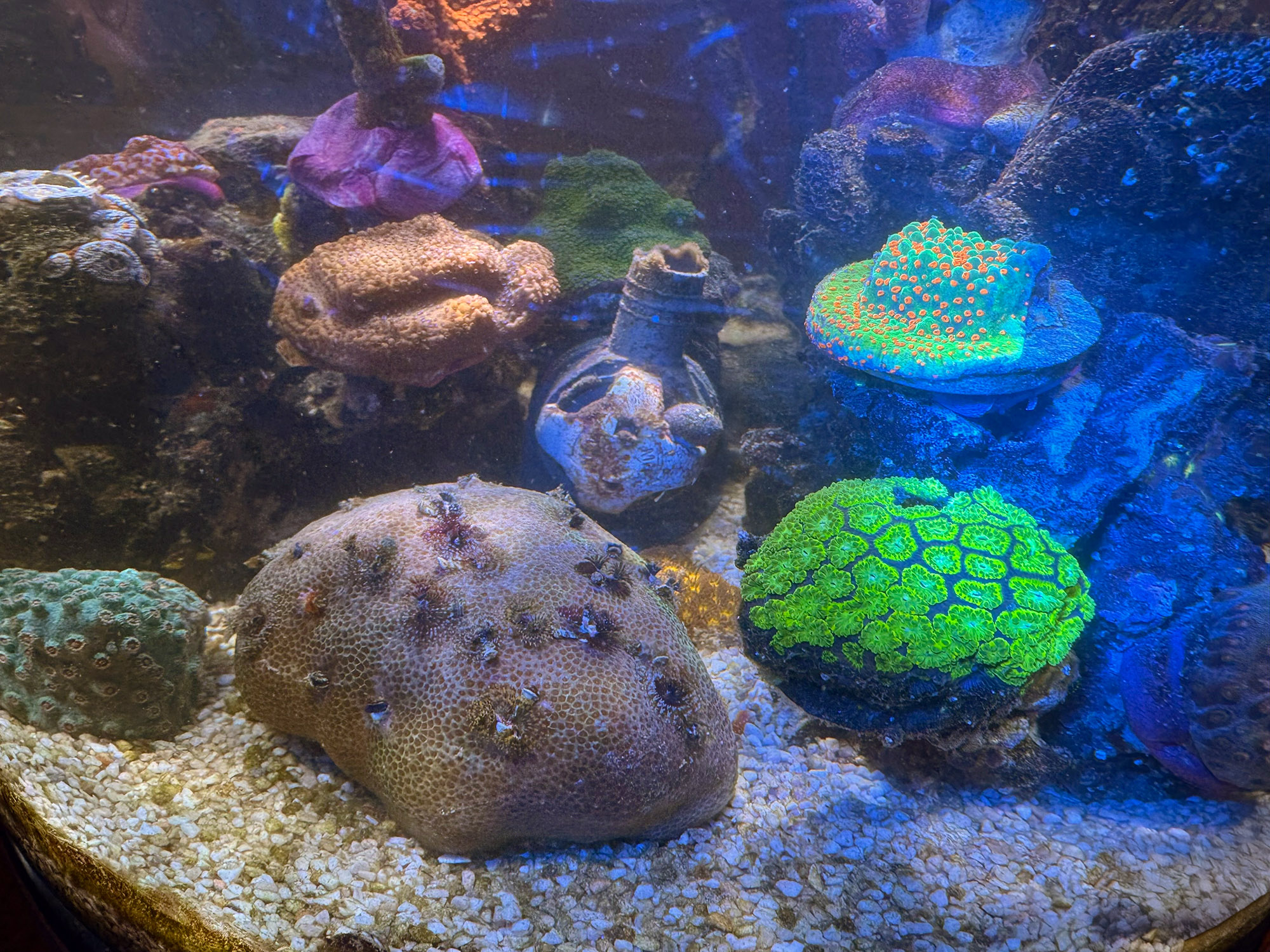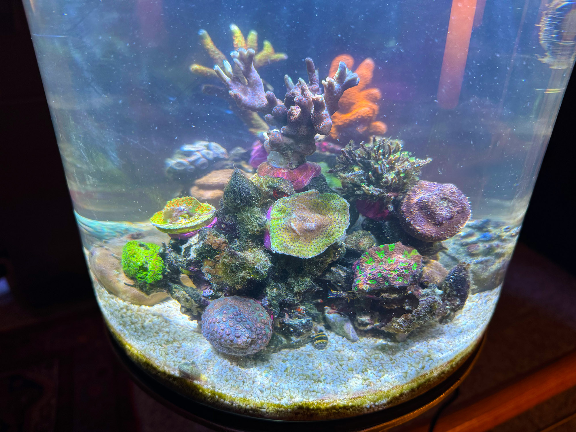 Für meinen Geschmack passt es jetzt, schön bunt mit meinen bevorzugten Lieblingsfarben, alles eher langsam wachsende Tiere und immer noch genügend Oberfläche von Lebendgestein zum Abweiden für die Seeigel, Einsiedler und Schnecken.
