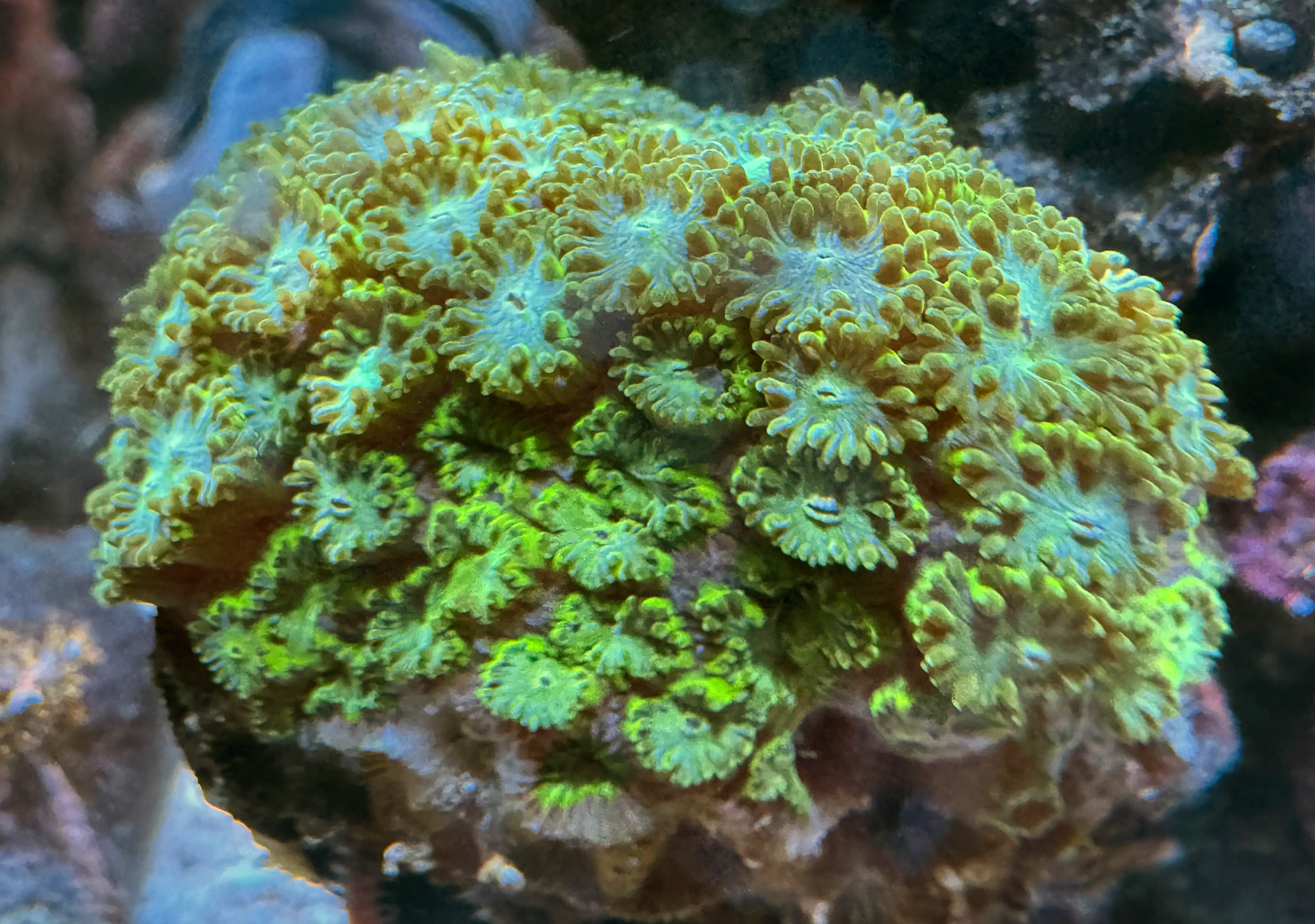 Die Polypen bilden Gruppen, sind recht klein, maximal 5mm, und fluoreszieren nicht.