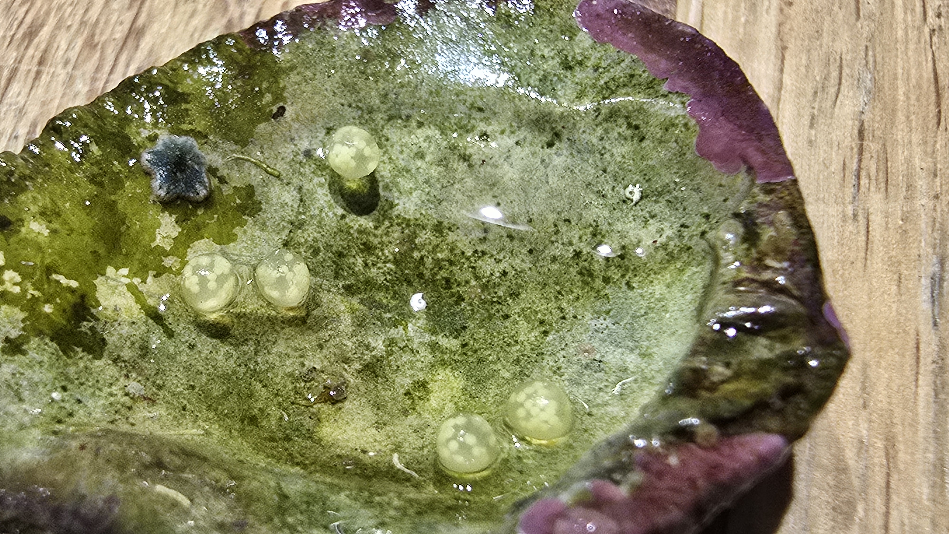 Nun heute sehe ich an der Unterseite glasige Eier mit beigen Punkten drinnen.