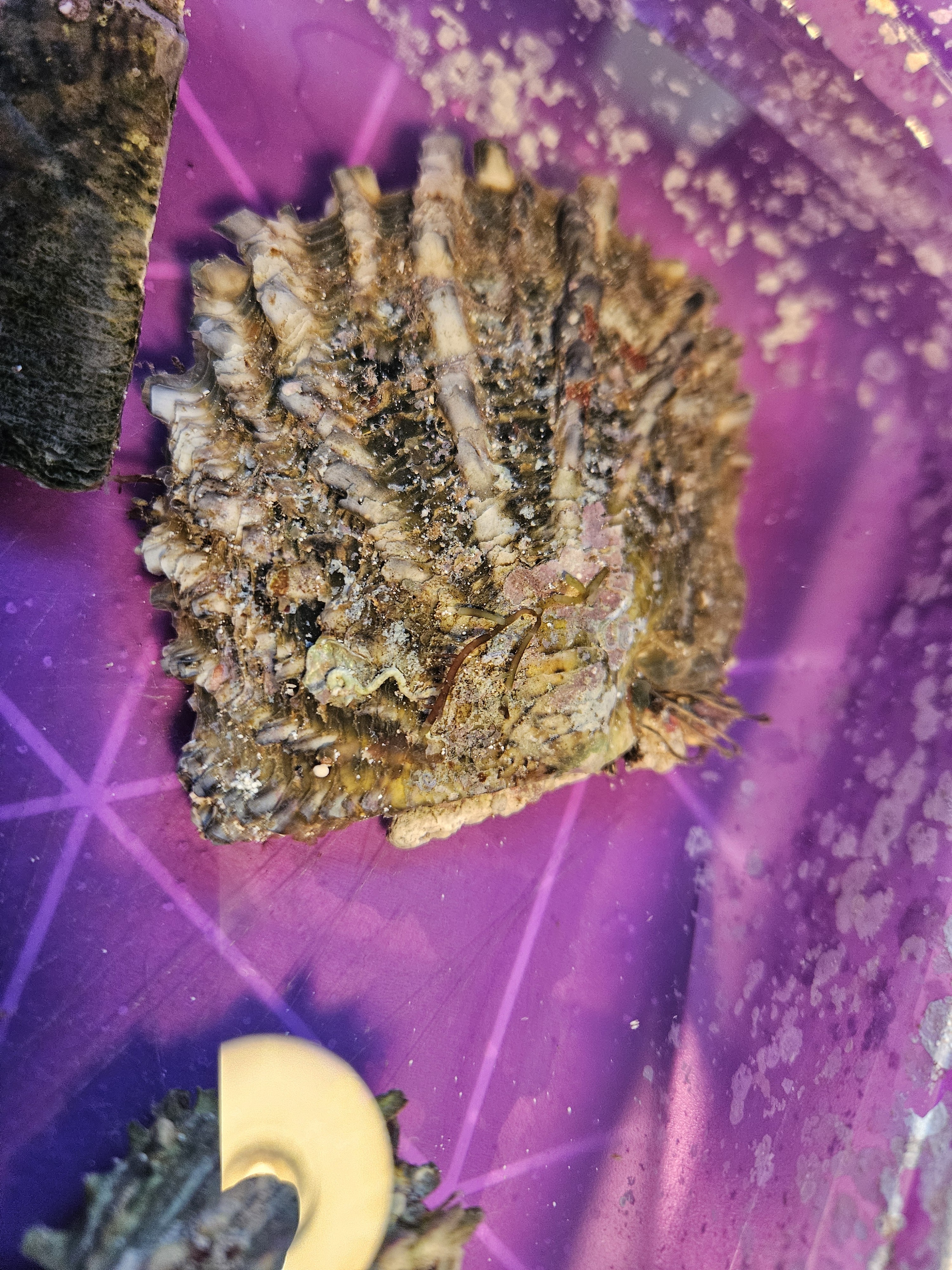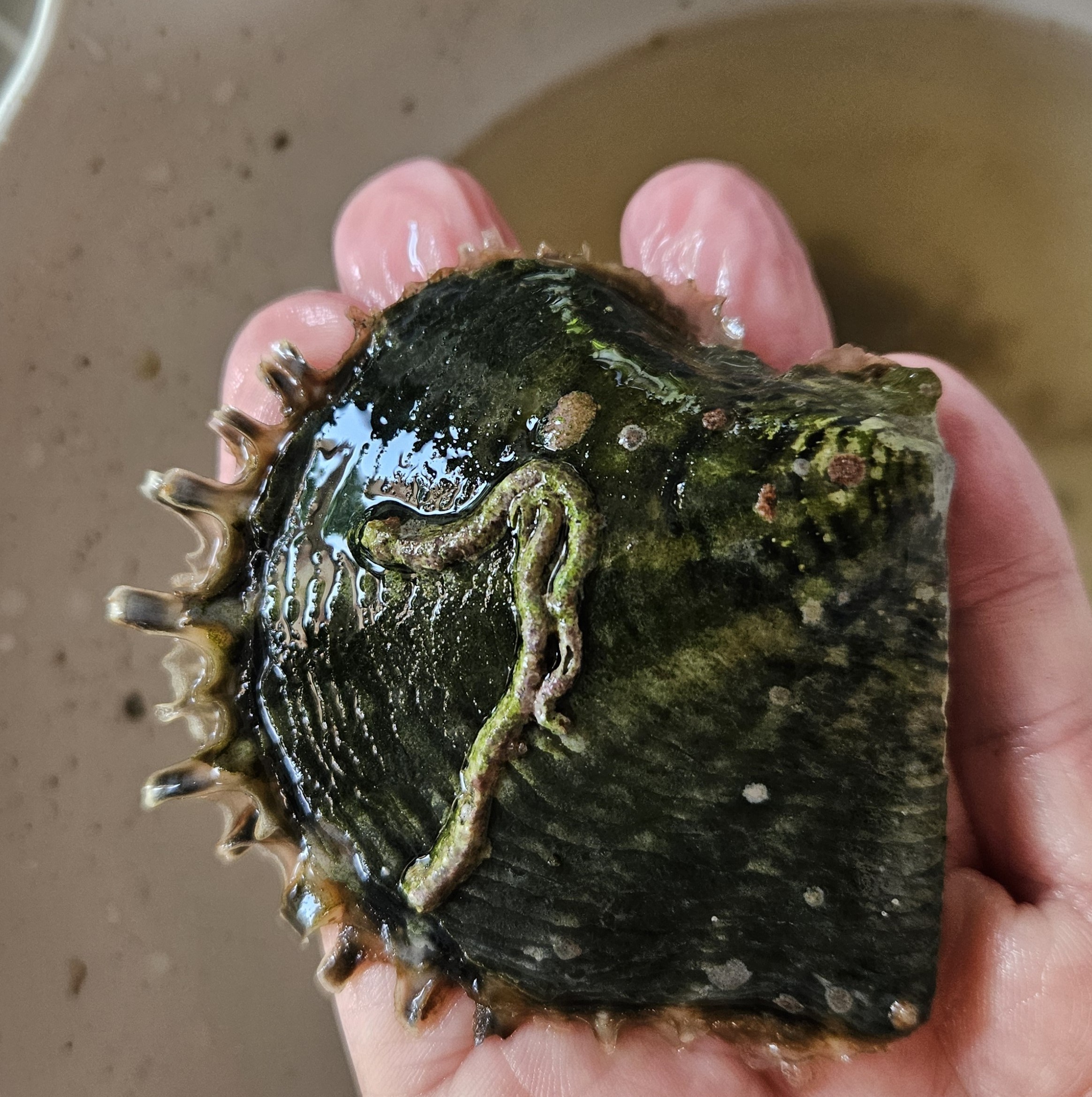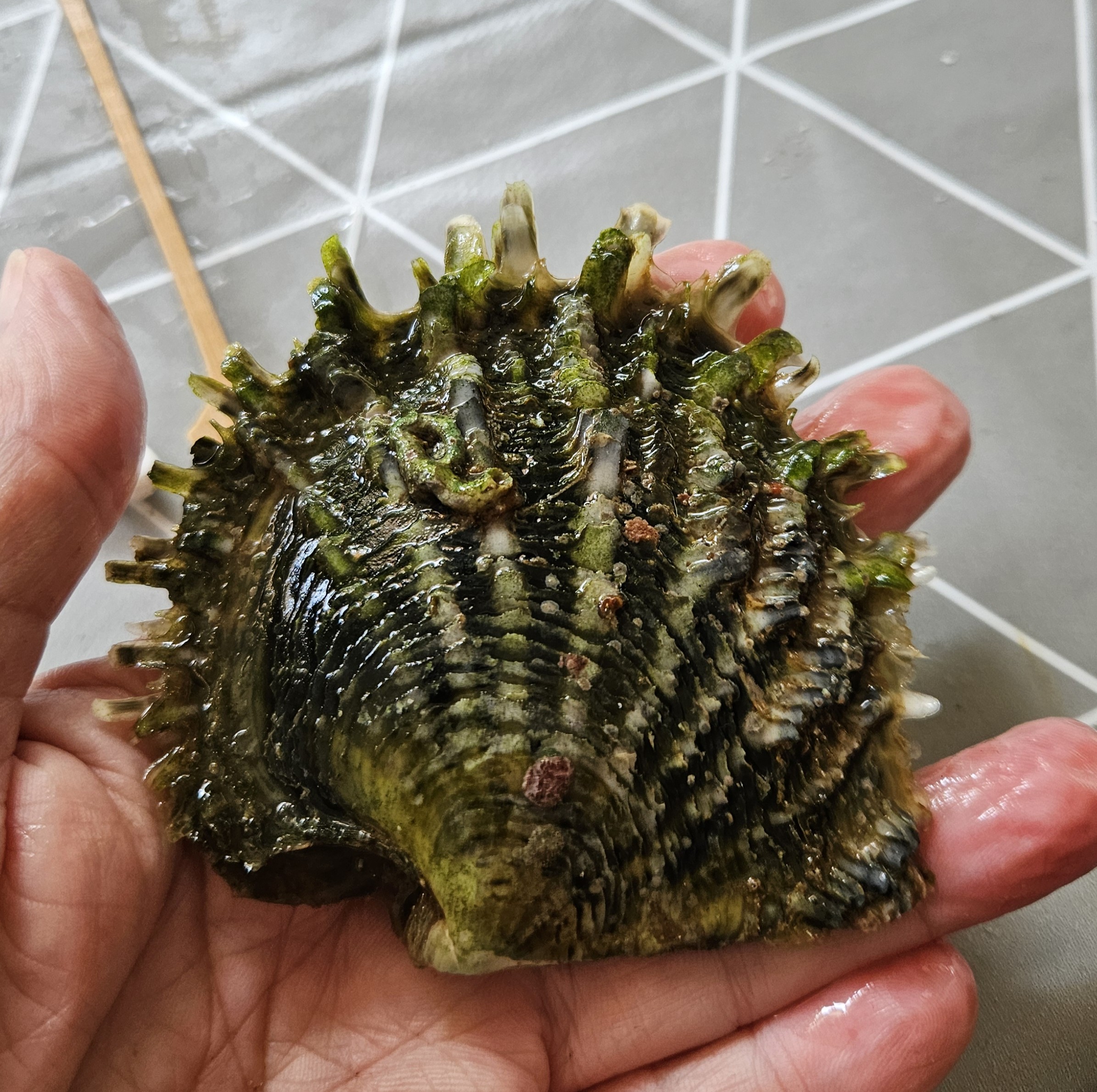 Wenn ich die verschiedenen im Netz gezeigten Bilder richtig deute, dann sind die stacheligen Fortsätze recht empfindlich, so daß diese recht schnell abgeschliffen werden. Bilder die von toten Schalen gezeigt werden, sind sie fast immer glattgeschliffen, aber zumindest ohne die Zacken.